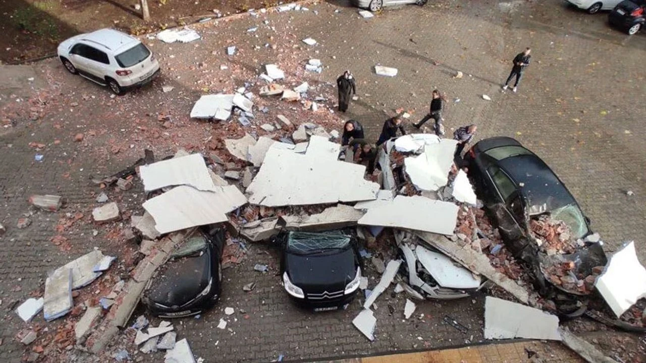 Okulda düzenlenen veli toplantısı sırasında fırtına nedeniyle okulun çatı duvarı yıkılarak, bahçede park halindeki 4 aracın üzerine düştü.