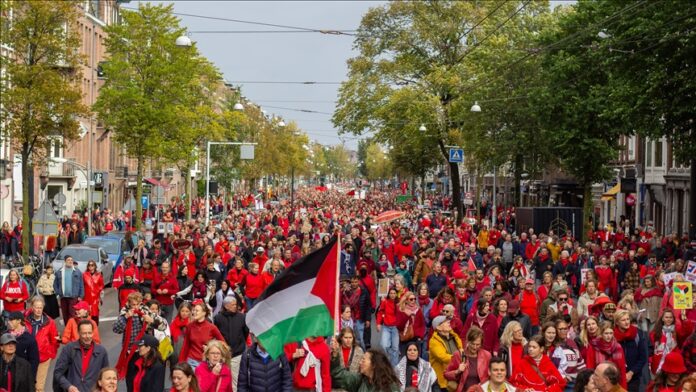 Hollanda’nın başkenti Amsterdam’da toplanan yaklaşık 250 bin kişi, hükümetin İsrail yanlısı politikasına tepki gösterdi.
