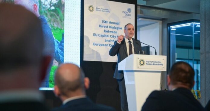 Lefkoşa Türk Belediyesi (LTB) Başkanı Mehmet Harmancı, güney Lefkoşa Belediye Başkanı Charalambos Prountzos’un davetiyle katıldığı “15. AB Başkent Belediye Başkanları ile Avrupa Komisyonu Arasında Direkt Diyalog Zirvesi” kapsamında düzenlenen bir oturumda konuşma yaptı.