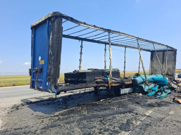 Gazimağusa-Lefkoşa ana yolu, Korkuteli Köyü mevkiinde, bu sabah, seyir halindeki tır aracın dorsesinin sol arka lastik balatasının sıkışıp ısınması sonucu yangın çıktı.